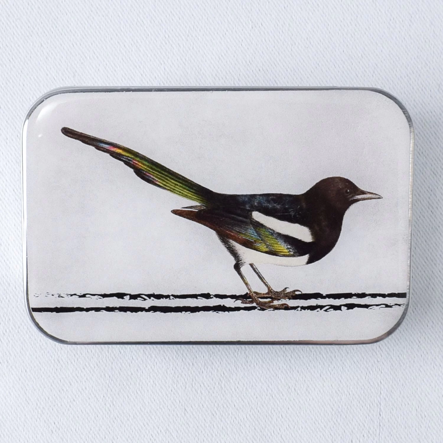 Ikke visste vi at en skjære kan være så vakker – bare se på de fargene! Dette motivet får du kun i den store størrelsen. Overflaten er håndstøpt med en slitesterk, blank harpiks (resin) som skaper en nostalgisk og solid finish. Boksen har skyvelokk.