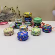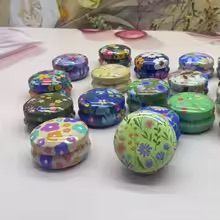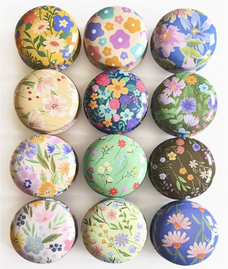 Runde, søte metallbokser med blomstermotiv og løst lokk. I pakke på 12 stk – varierte blomstermotiv.