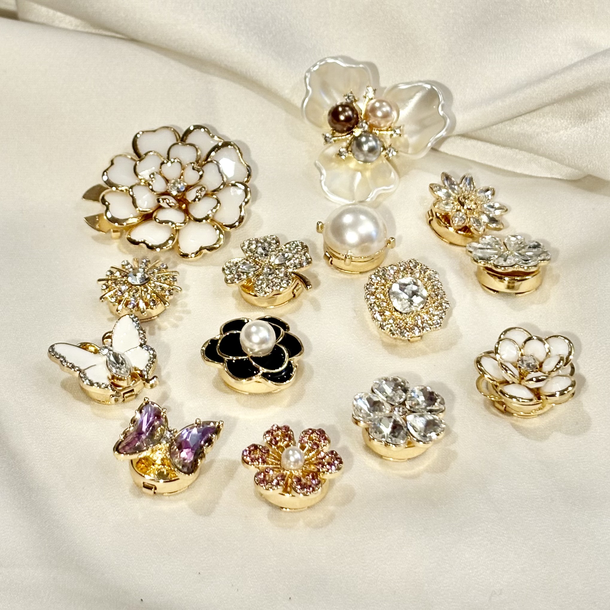Klassisk og kledelig! Disse nydelige «clip on» pynteknappene gjør hverdags-plagget til en fest! Passer til knapper opp til 13 mm.