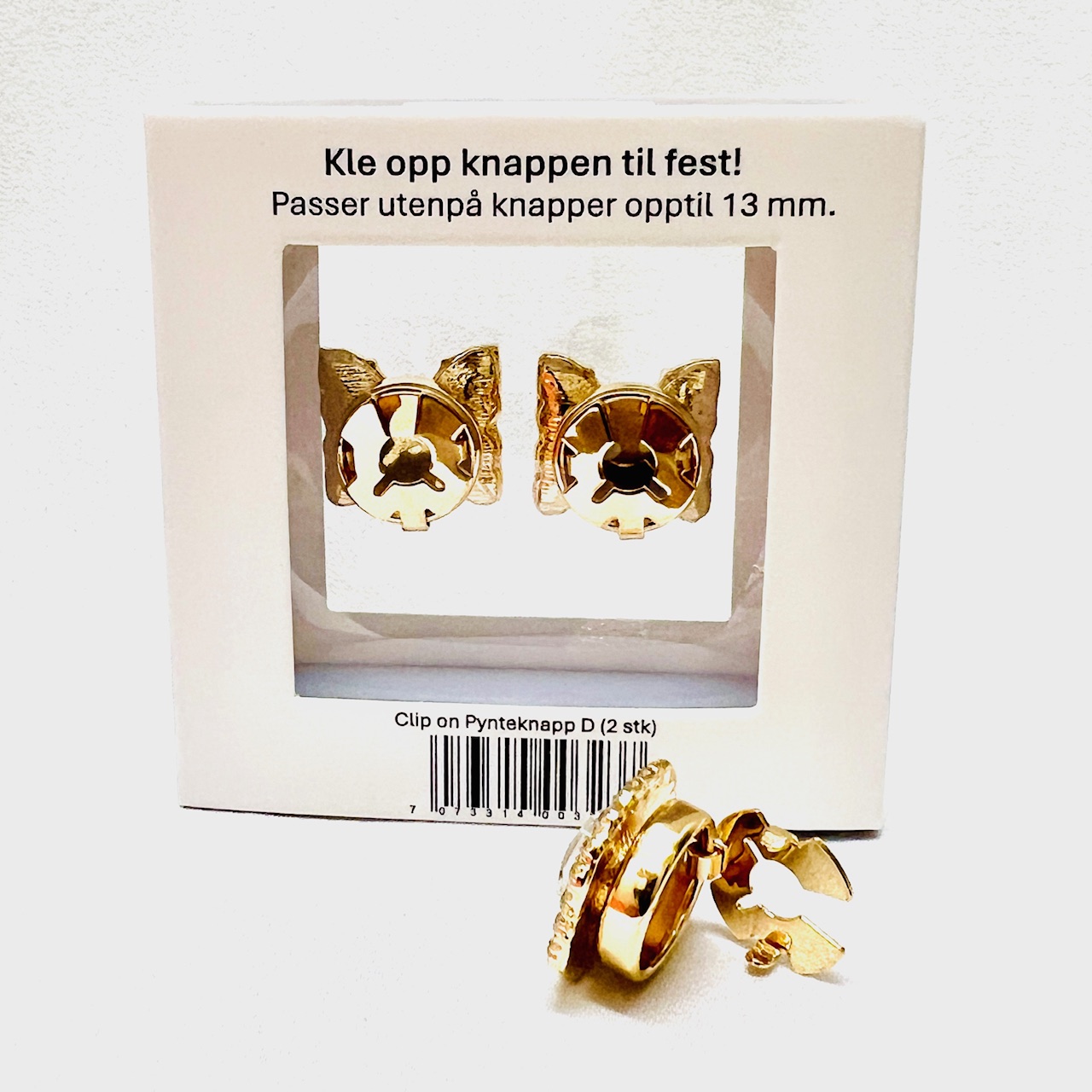 Clip On-knappene leveres i en praktisk gjennomsiktig gaveeske, som beskytter overflaten.