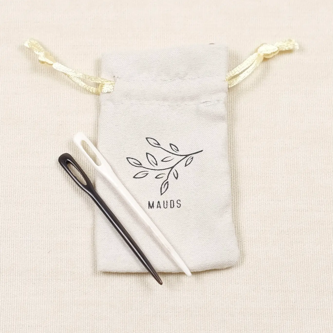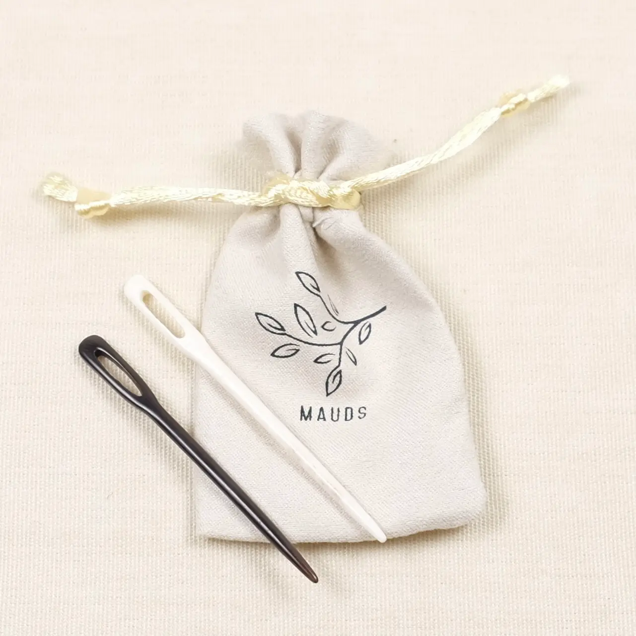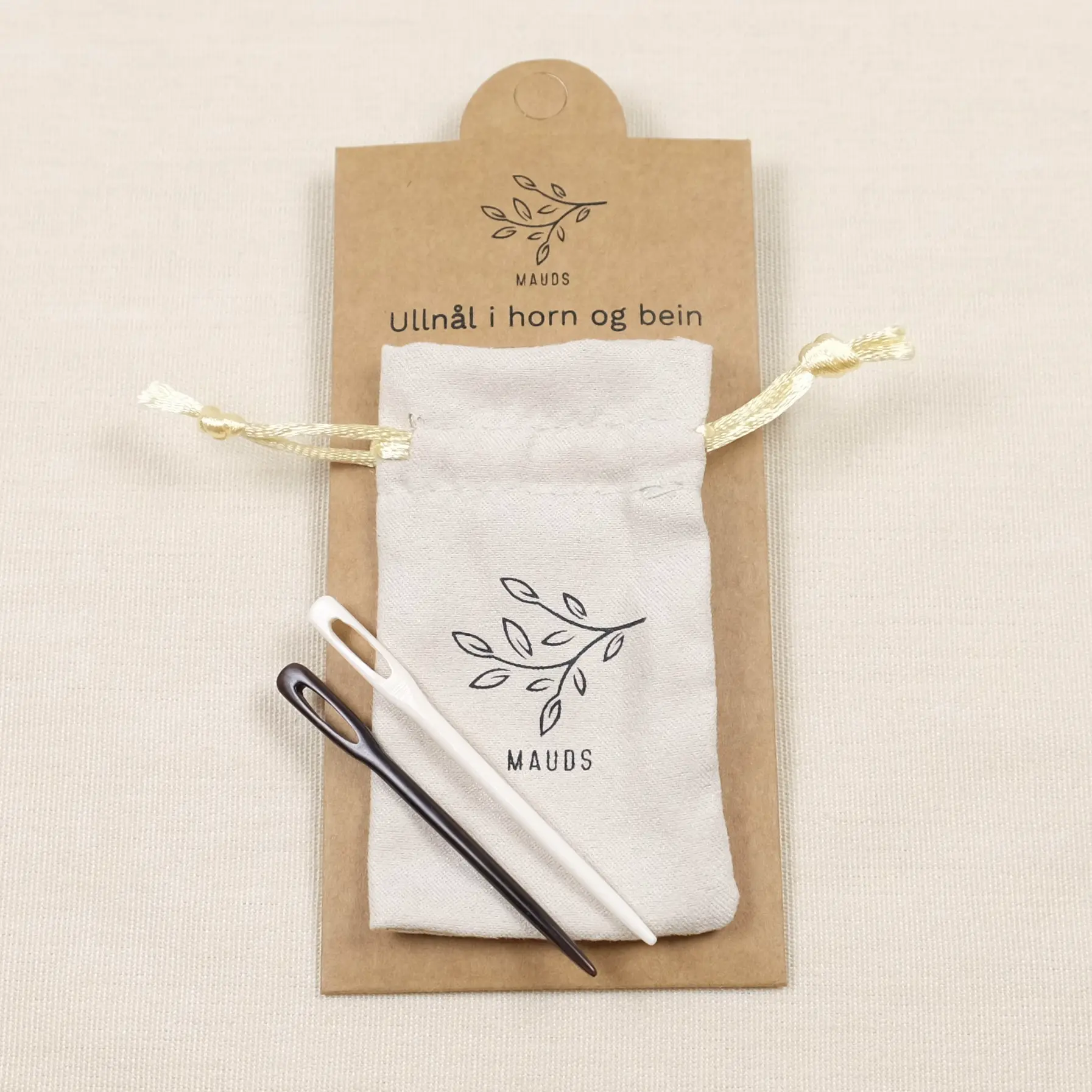 Hver stoppenål er håndlaget og unik. En av bøffelbein og en av bøffelhorn. Materialene er ikke bleket eller farget og vil derfor ha unik patina. Leveres i en lekker oppbevaringspose med knytebånd.