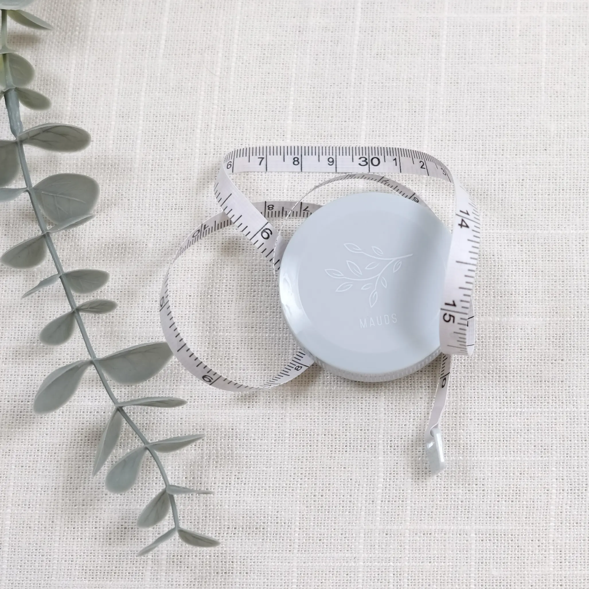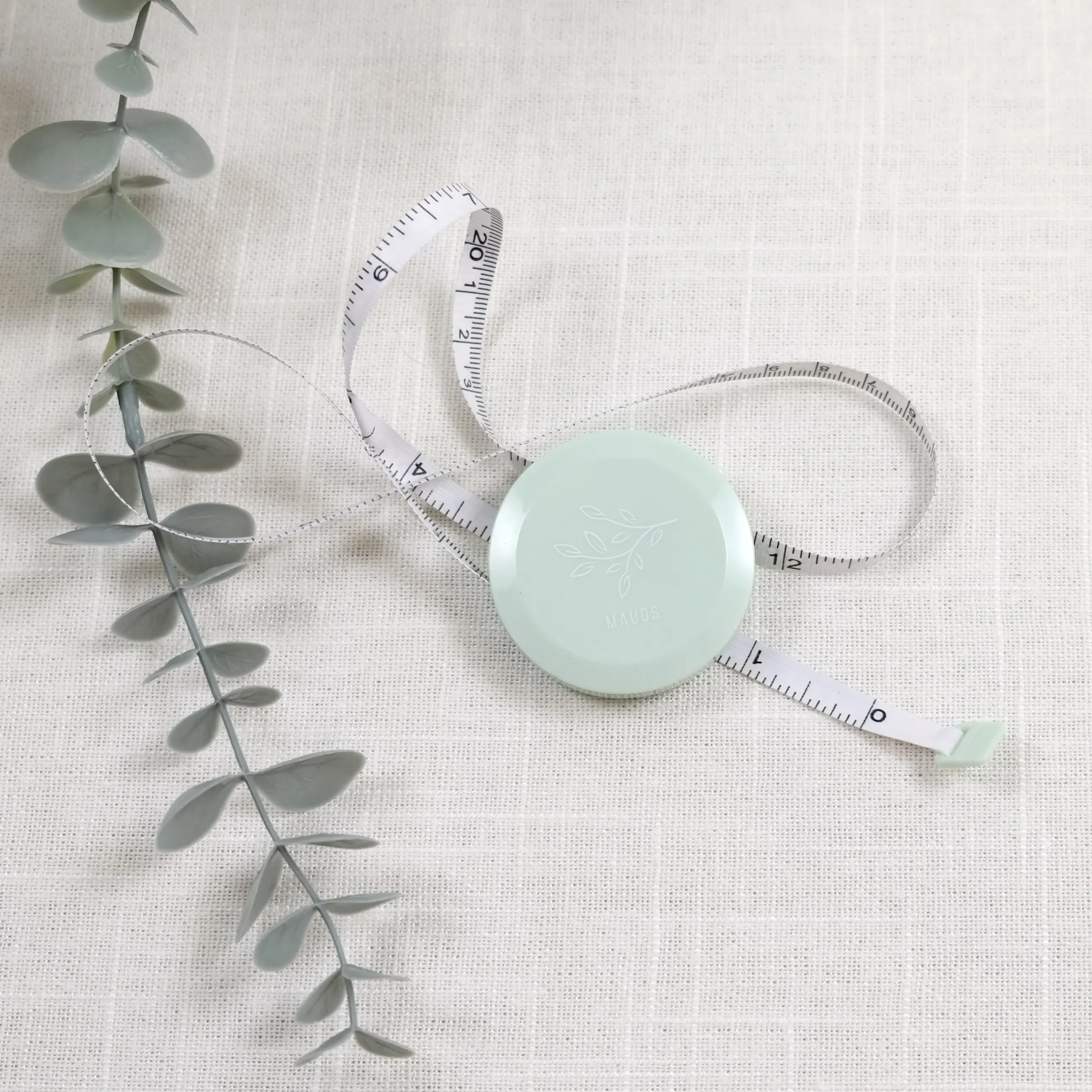 Målebånd med mekanisk innrulling når du presser på knappen. Rullemålbåndet har total målelengde 150 cm, og påmerket med inch på ene siden og cm på andre siden. Hvitt målbånd med svarte tall og merker.