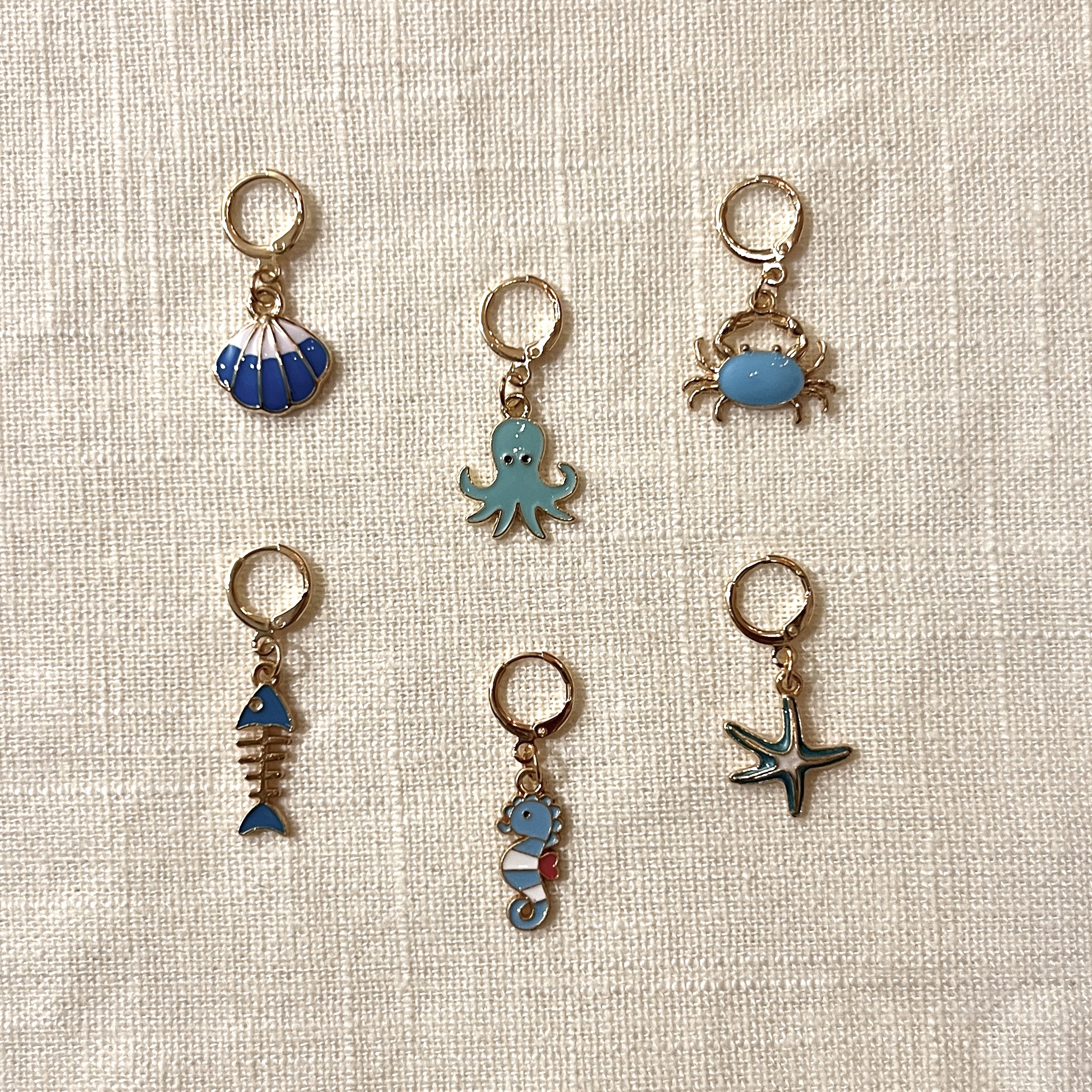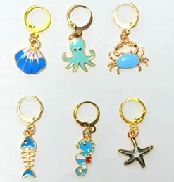 Herlige maskemarkører i metall med motiver fra strand og sjø. Åpne markører med karabinkrok i gylden metall. 4 av hvert motiv.