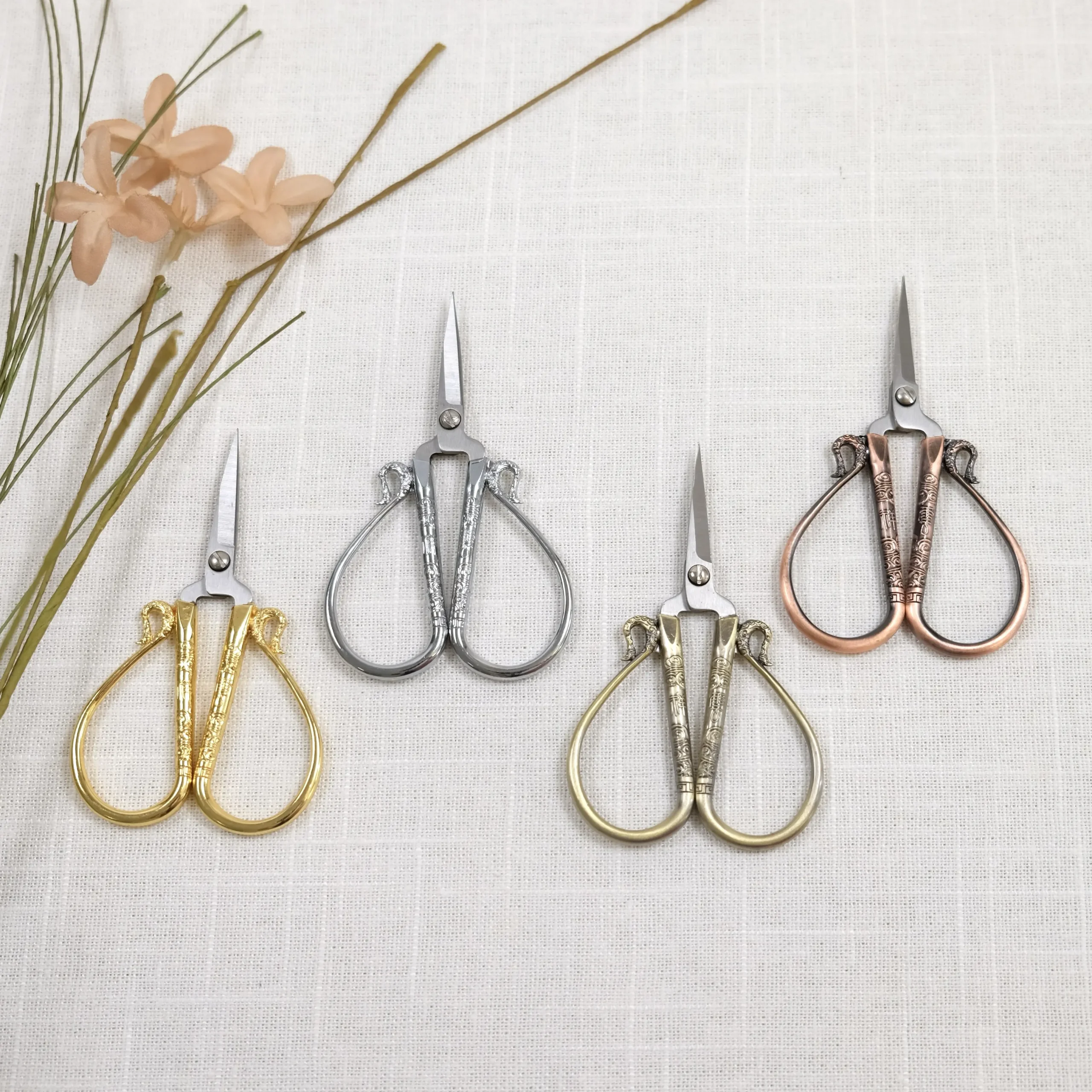 Sølv, gull, matt bronsefarge og kobberfarge med varme rosatoner- alle har blank stål sakseblad.